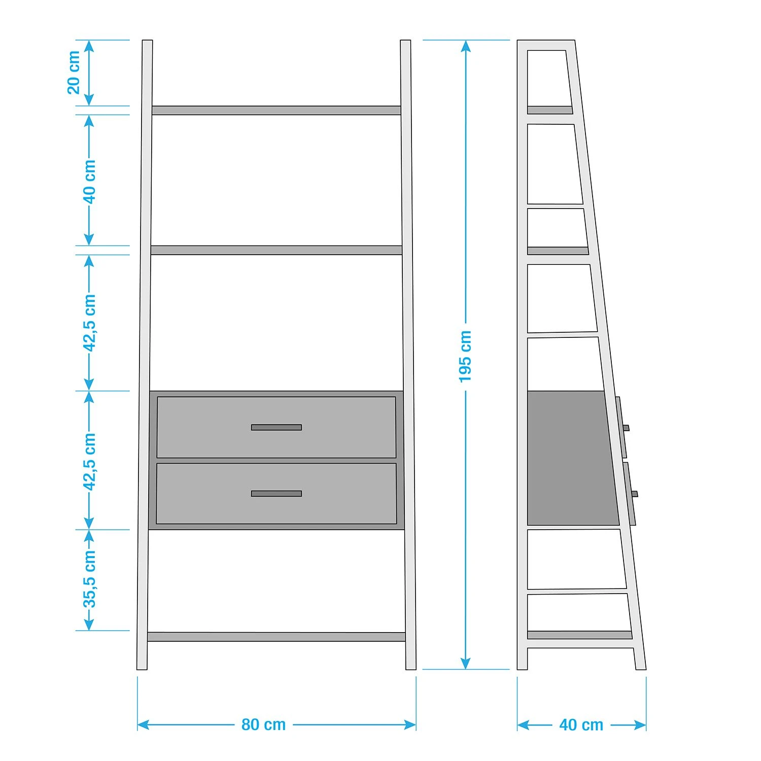 - 2 Schubladen & 3 offene Fächer
