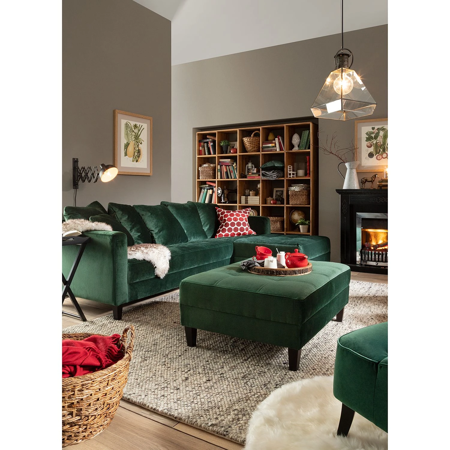 Norrwood Ecksofa Meyford – Samt Ravi: Antikgrün – Ottomane davorstehend rechts – Mit Hocker