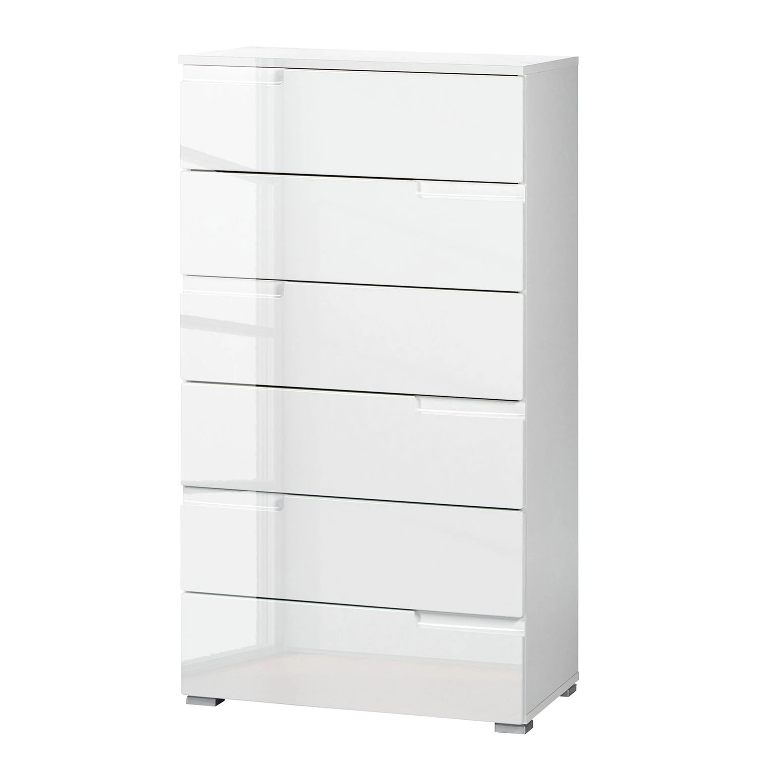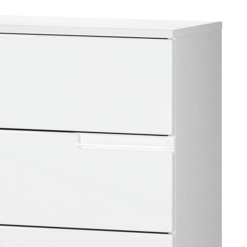Die Kommode Larado III bietet mit ihren sechs Schubladen viel Stauraum. Sie kann in verschiedenen Räumen aufgestellt werden. Im Schlafzimmer lassen sich zum Beispiel Socken und Wäsche in ihr verwahren, während im Wohnzimmer Spiele, Zeitschriften und andere Kleinigkeiten ihren Platz in der Kommode Larado III finden. Gefertigt wurde das Möbelstück aus MDF-Platten der Güteklasse E1. Durch die Folierung in Hochglanz Weiß wirkt die Kommode sehr elegant. Dank der klaren Formen passt sie zudem sehr gut zu modernen Einrichtungsstilen.