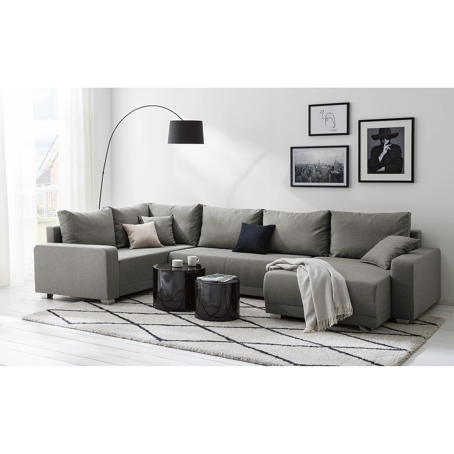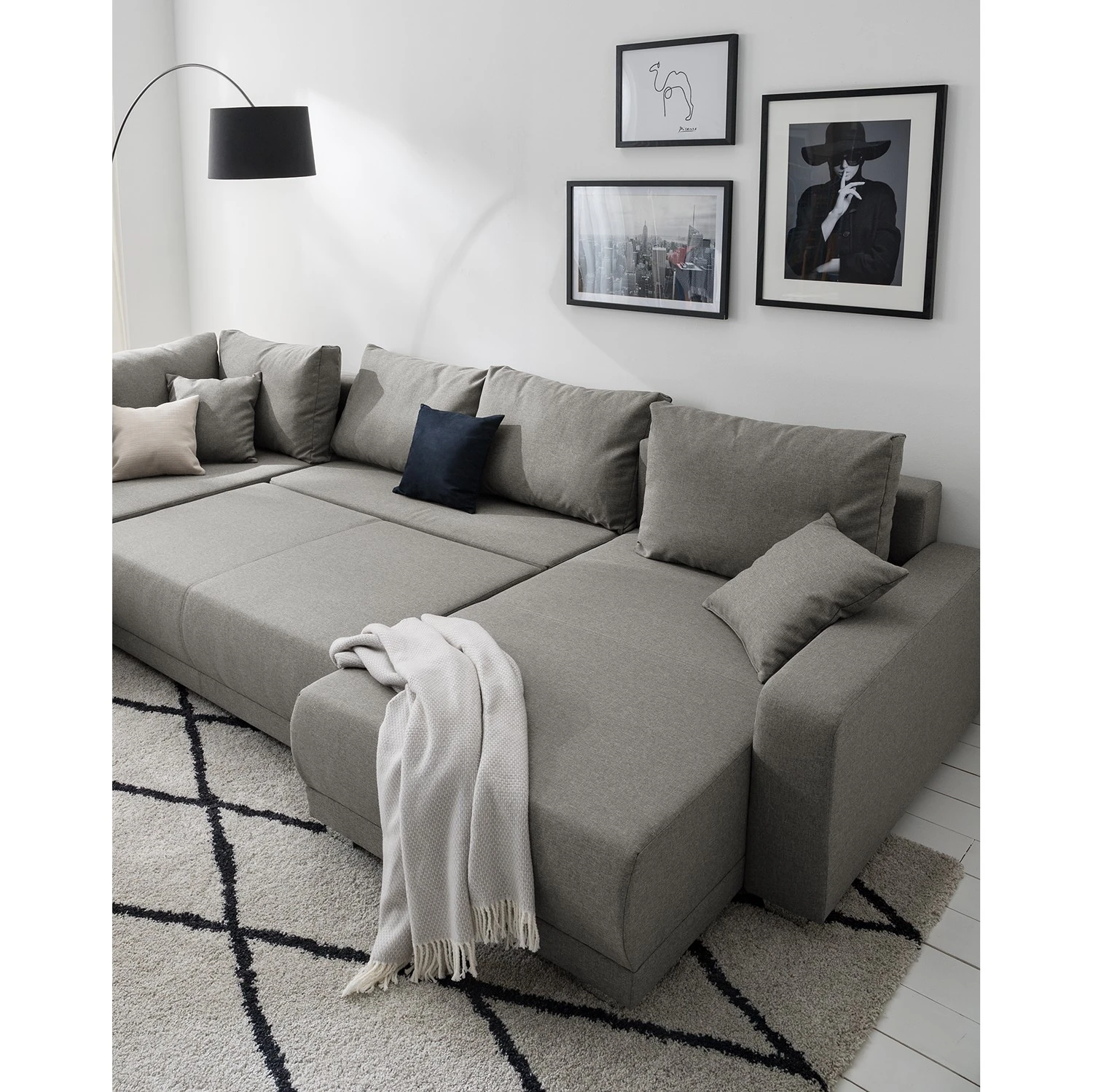 - Lieferumfang: Wohnlandschaft inkl. 6 Rücken- und 2 Zierkissen, ohne Dekoration