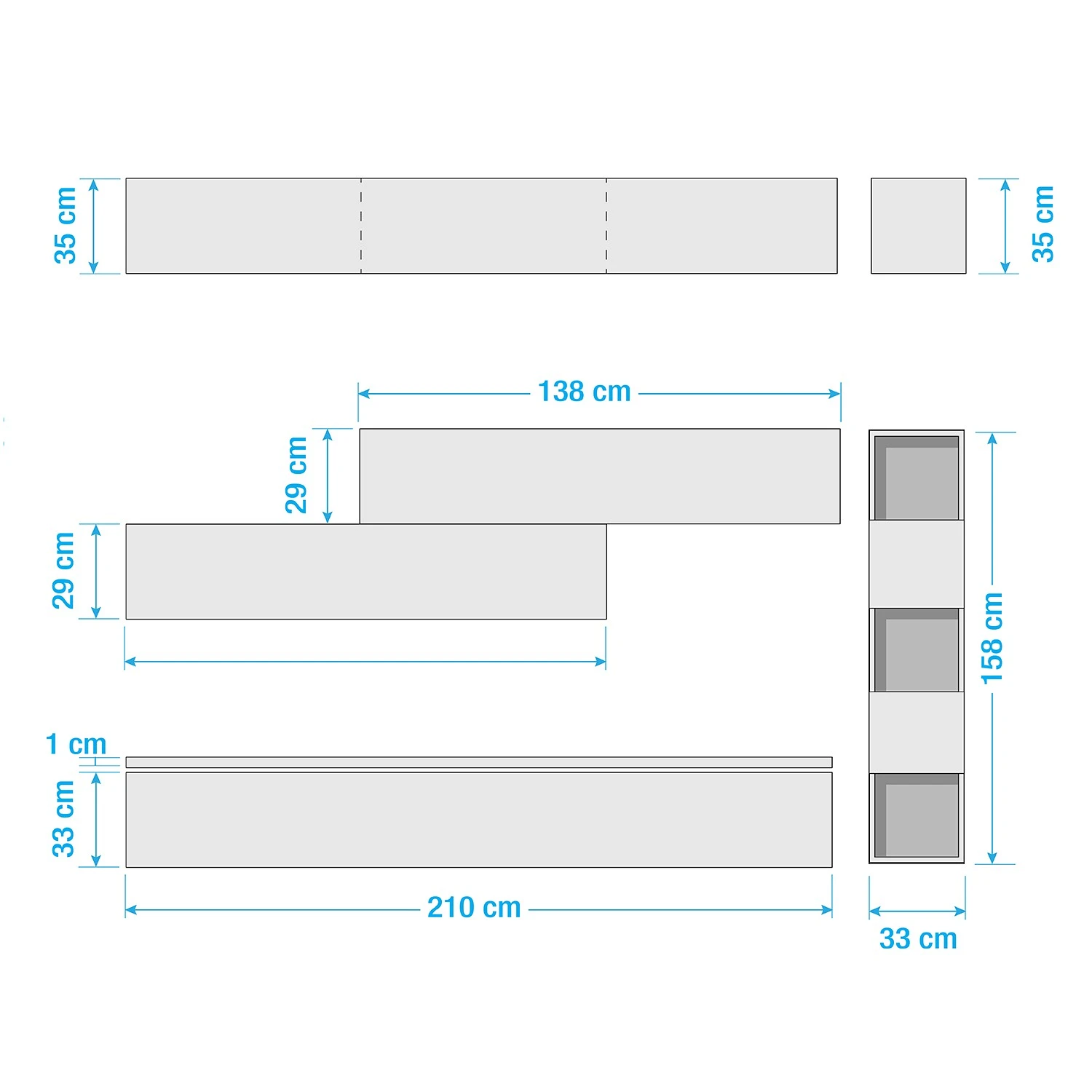 - Wandregal: 33 x 158 x 35 cm