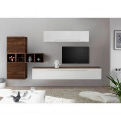 - Lieferumfang: Wohnwand bestehend aus 1 TV-Lowboard mit Klappe, 1 Top für TV-Lowboard, 1 Hängeelement mit Klappe, 2 Hängewürfel & 4 Wandregalen