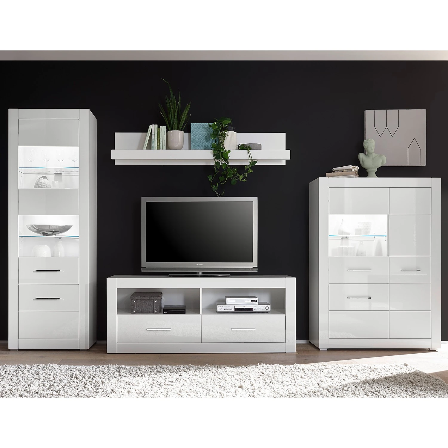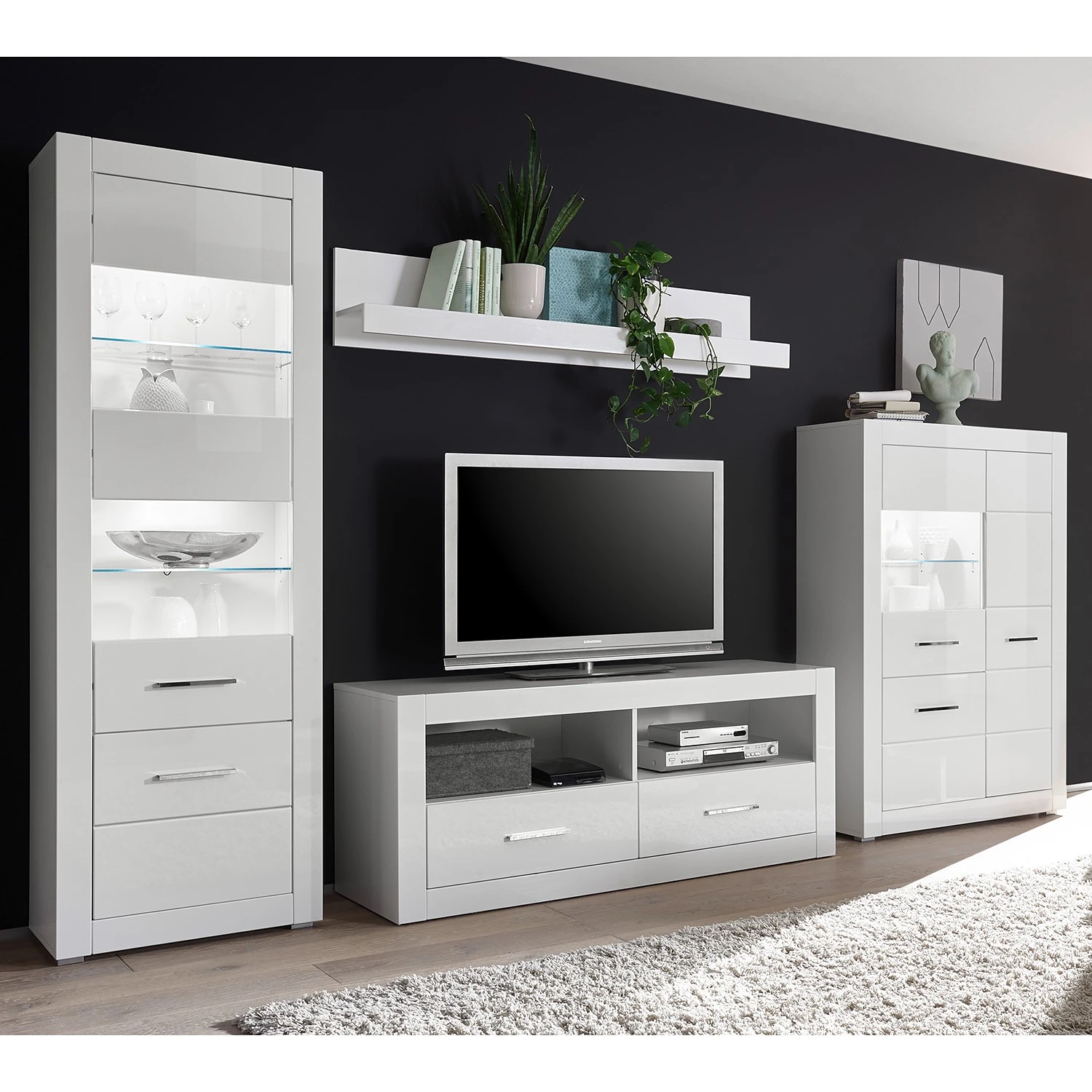 - Lieferumfang: Wohnwand bestehend aus 1 Vitrine, 1 Wandboard, 1 Lowboard & 1 Highboard ohne Beleuchtung & Dekoration