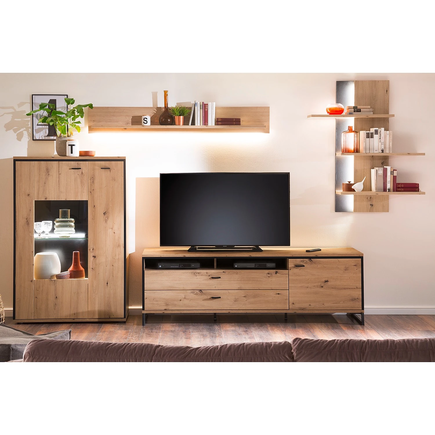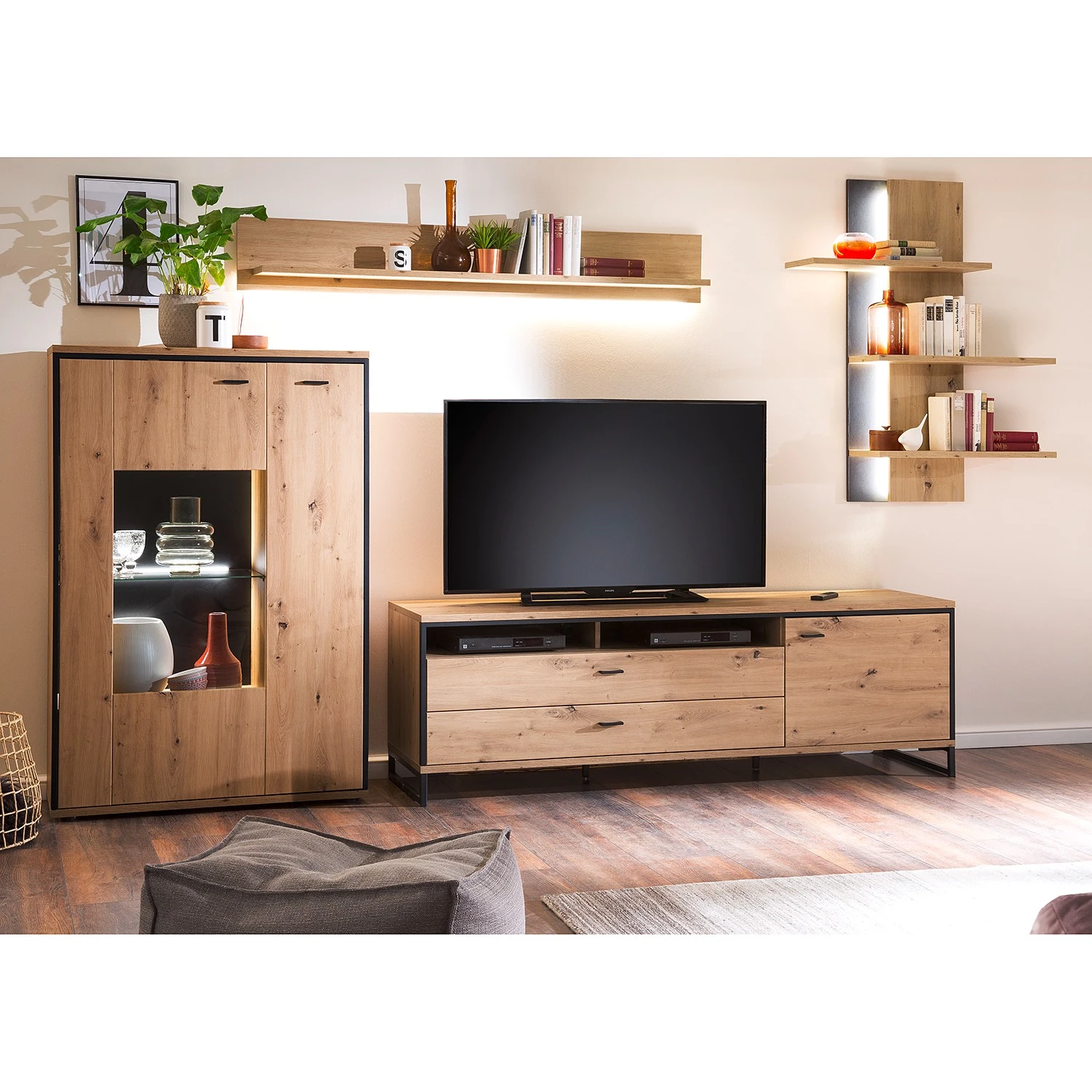 - Lieferumfang: 1 Highboard, 1 Wandboard, 1 Lowboard & 1 Wandregal ohne Beleuchtung & Dekoration