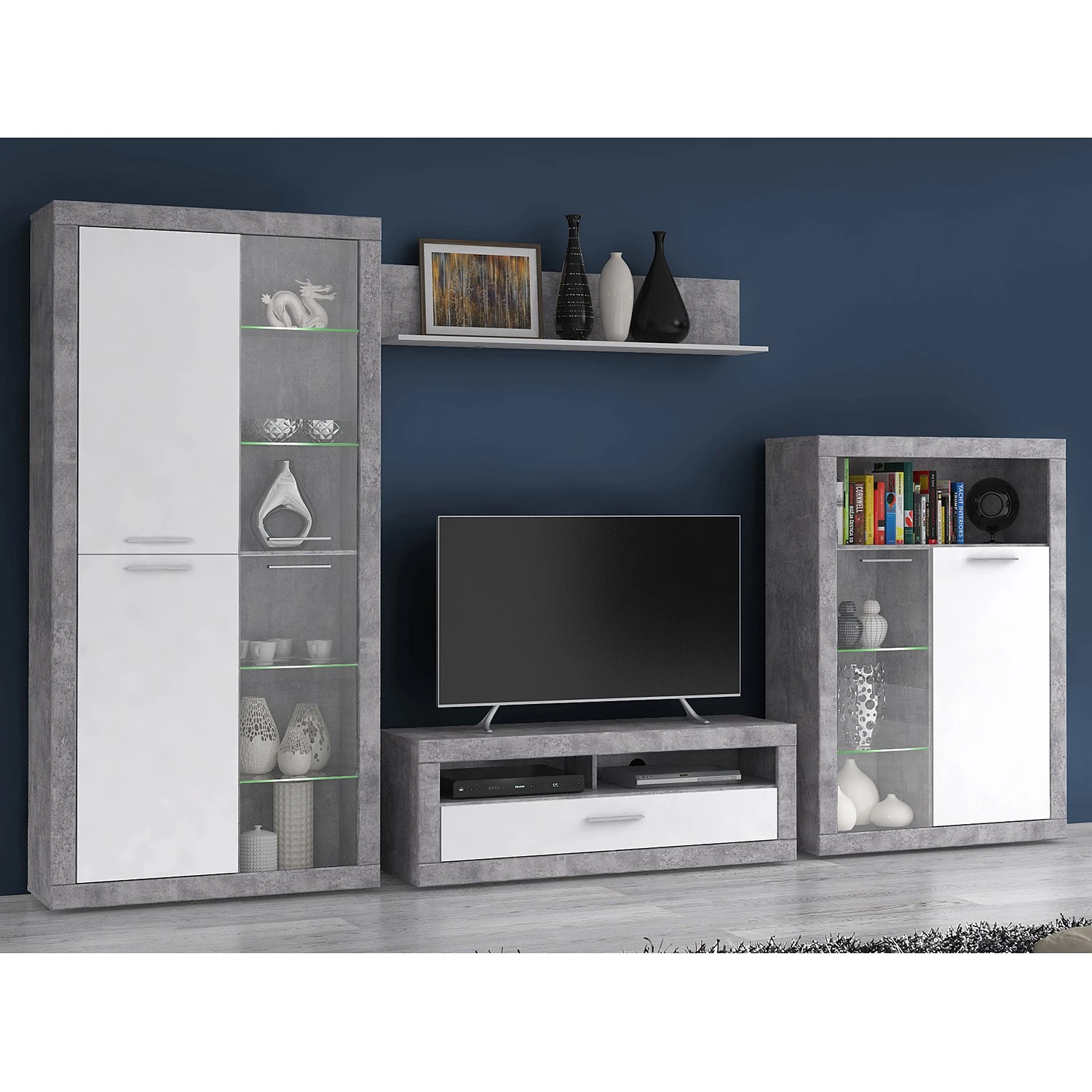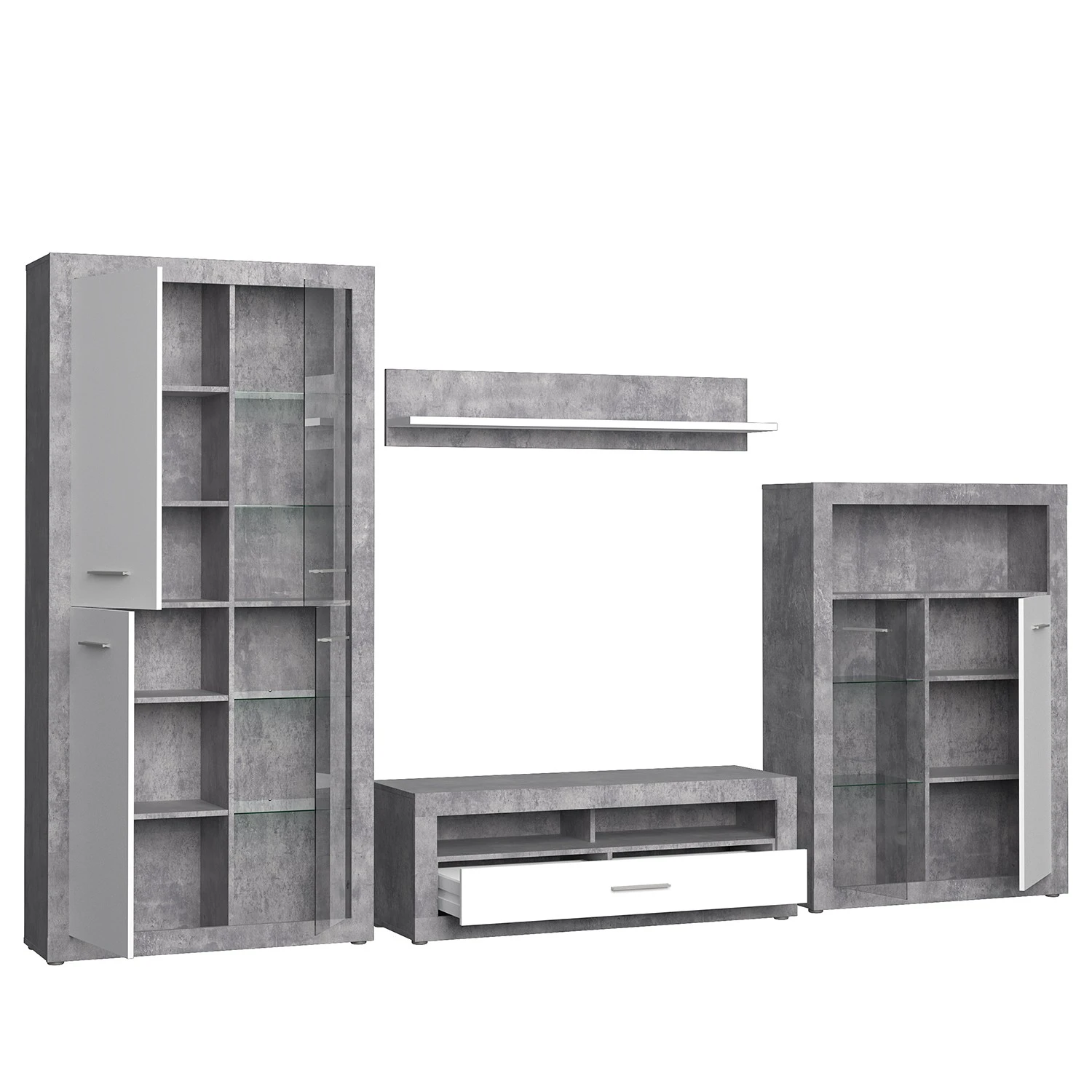 - Lieferumfang: Wohnwand bestehend aus 1 Vitrine, 1 Wandboard, 1 Lowboard & 1 Highboard ohne Beleuchtung & Dekoration