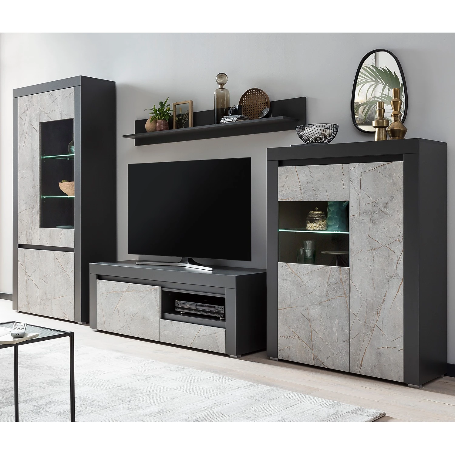 - Lieferumfang: Wohnwand bestehend aus 1 Vitrinenschrank, 1 Wandboard, 1 Lowboard & 1 Highboard ohne Beleuchtung & Dekoration