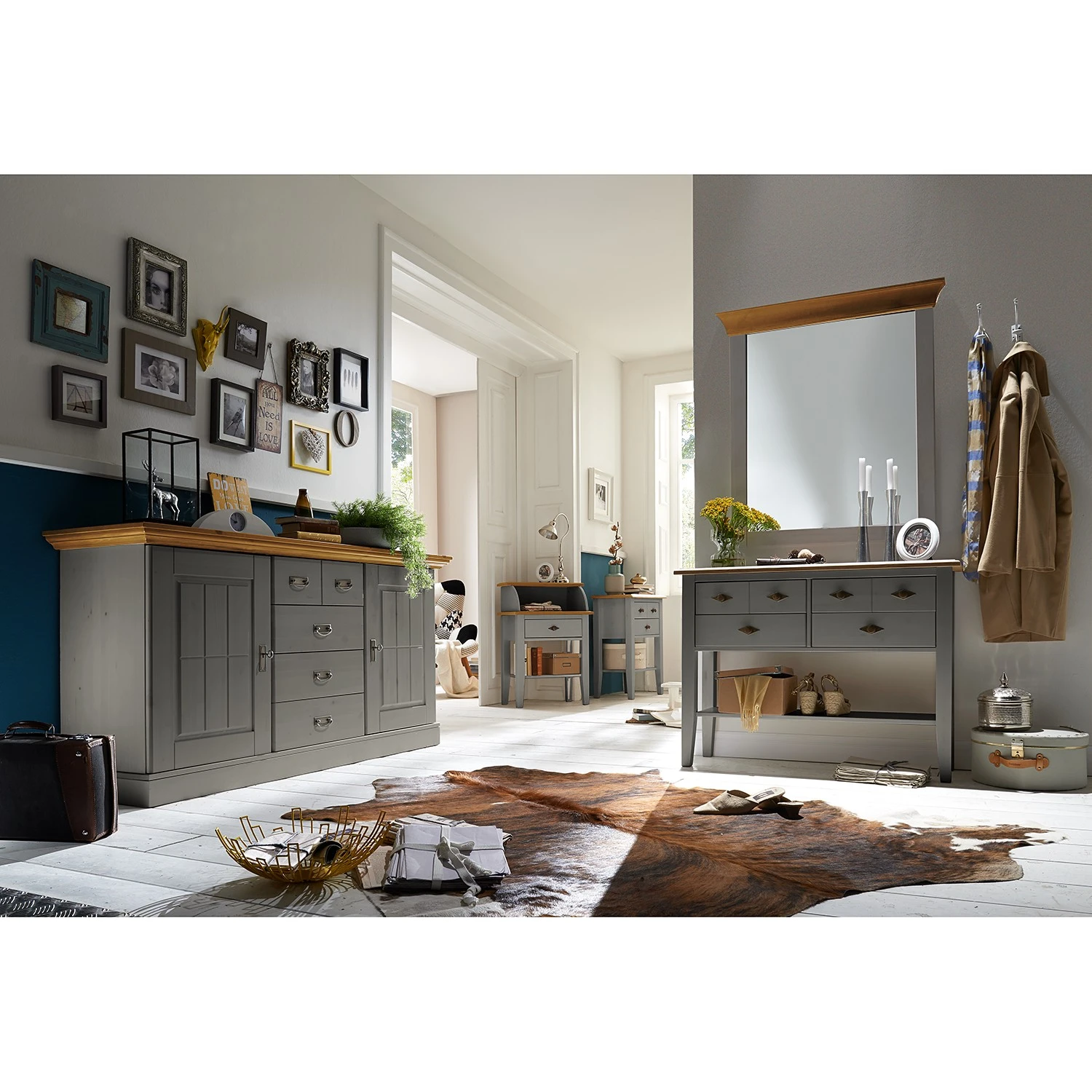 - Front & Korpus: Massivholz Kiefer, lackiert