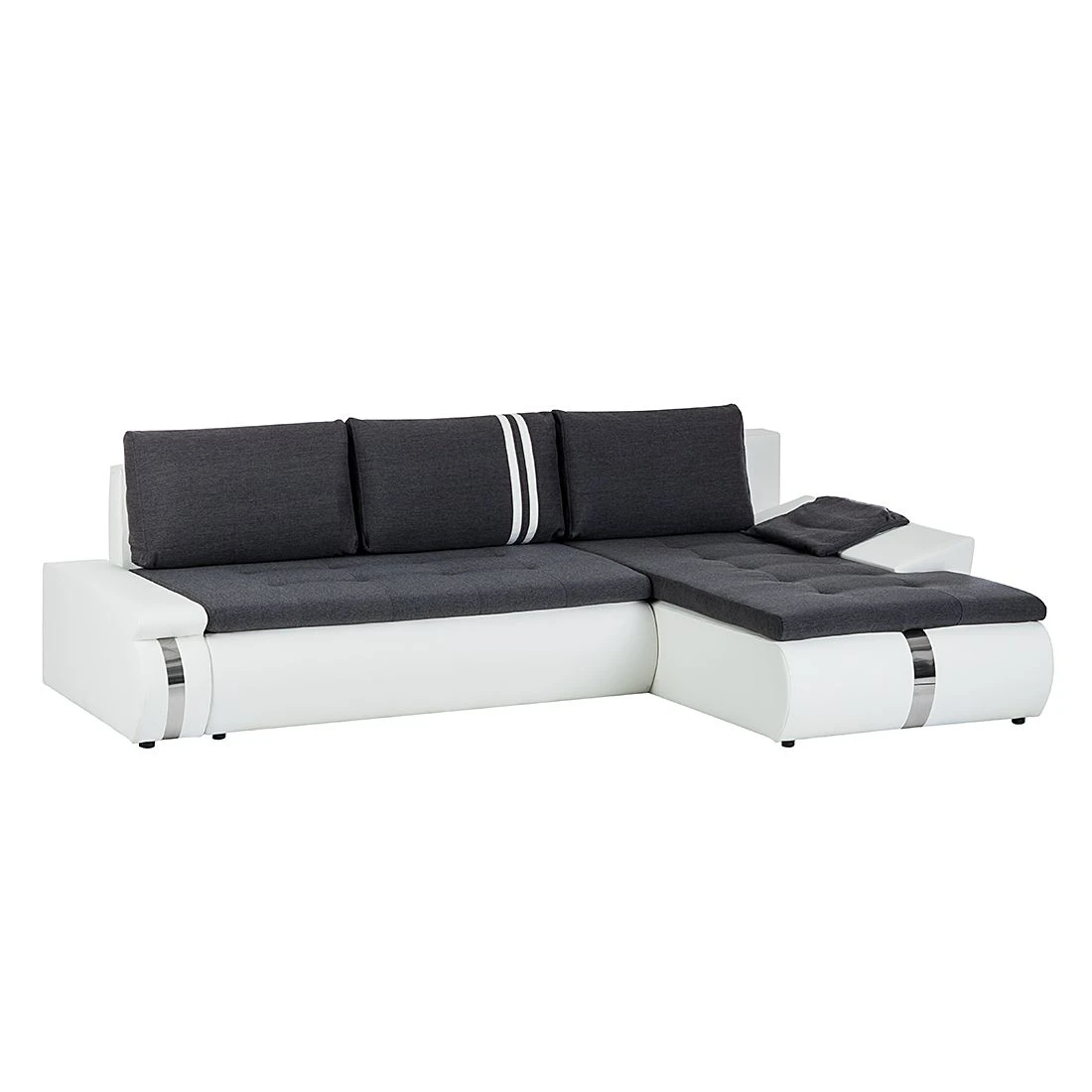 Das Ecksofa Huleva von mooved ist im modernen Lounge-Design gestaltet. Klare Linien mit gut durchdachter Ästhetik sowie ein gelungener Farb- und Materialmix bestimmen hier den Look. Abgerundet wird das Sofa-Design durch eine charakteristische Knopfheftung der Sitzflächen, farblich abgesetzte Streifen auf dem mittleren Rückenkissen und glänzende Chromzierelemente, die ein echter Blickfang sind. Überzeuge Dich selbst und hole Dir das Ecksofa Huelva von mooved mit praktischer Schlaffunktion jetzt nach Hause.