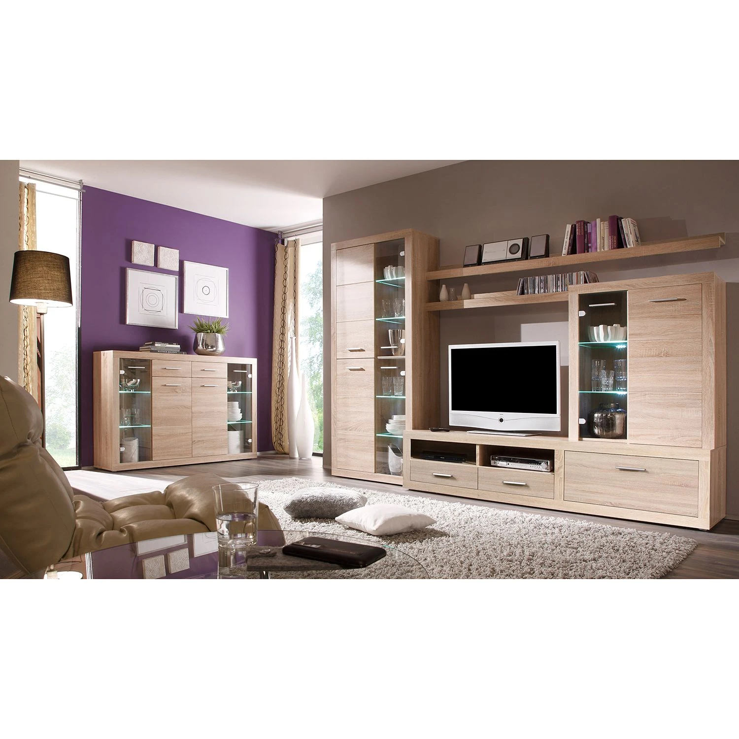- Lieferumfang: Wohnwand inkl. Beleuchtung, ohne Dekoration