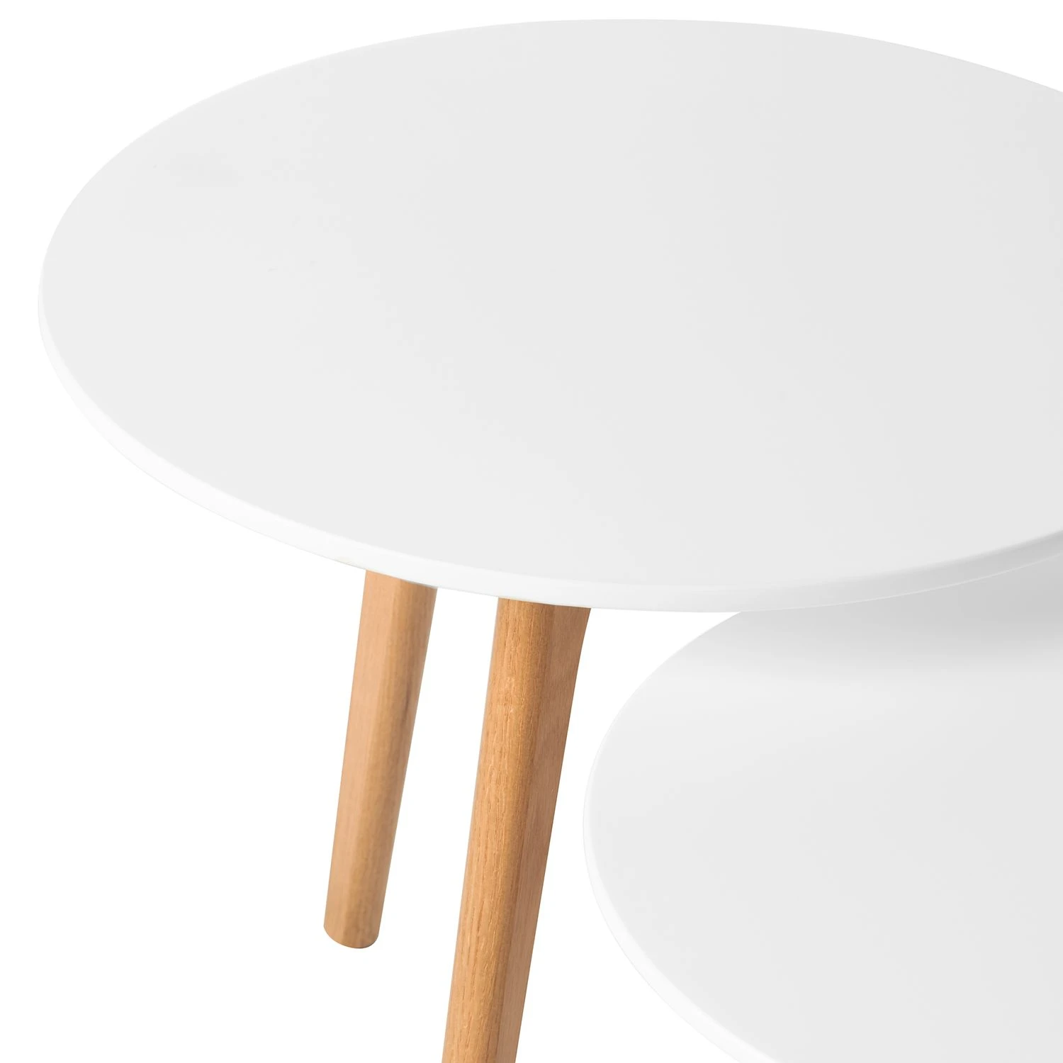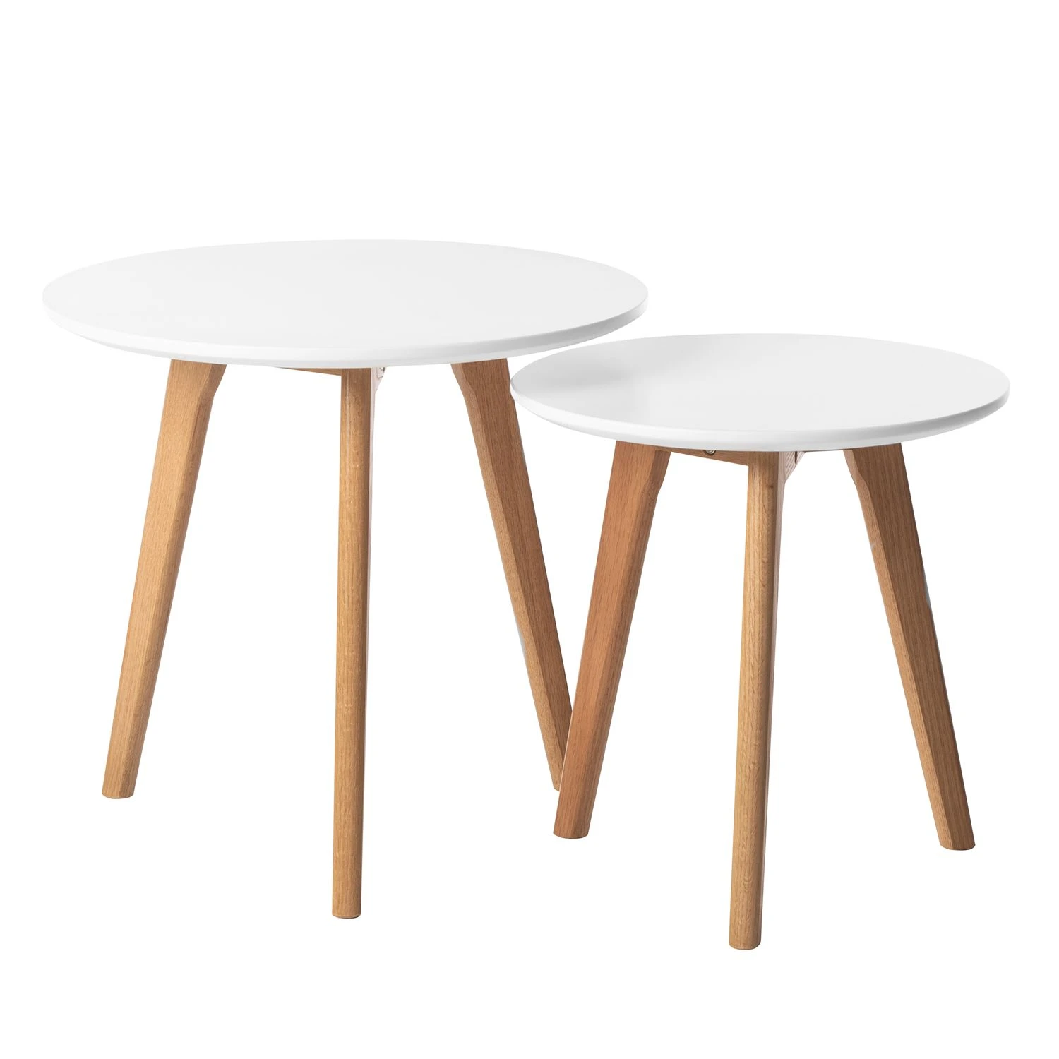 Klassisch und dezent präsentiert sich der zweifarbige Beistelltisch Nilla I im 2er-Set. Zu dem praktischen Set gehören ein großer sowie ein kleiner Beistelltisch. Die abgerundeten MDF-Tischplatten bieten dank der folierten Oberfläche einen besonderen Schutz gegenüber schädlichen Einflüssen. Zudem garantieren die massiven Füße aus lackiertem Massivholz Eiche einen sicheren, stabilen Stand. Durch die natürliche Maserung auf den Beinen trägt das Beistelltisch Nilla I 2er-Set zu einer gemütlichen Atmosphäre im Zuhause bei. Mit den kompakten Maßen passen die Tischchen als Ablage neben das Bett oder neben einen Sessel. Sie bieten genug Ablagefläche für Getränke, Lampen oder Bücher. Eine erstklassige Verarbeitung und Produktion versprechen eine lange Lebensdauer.