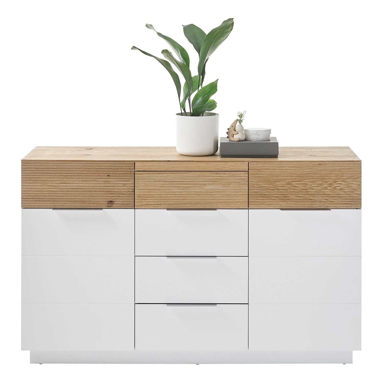 - Front: Massivholz Eiche, lackiert / Spanplatte, lackiert