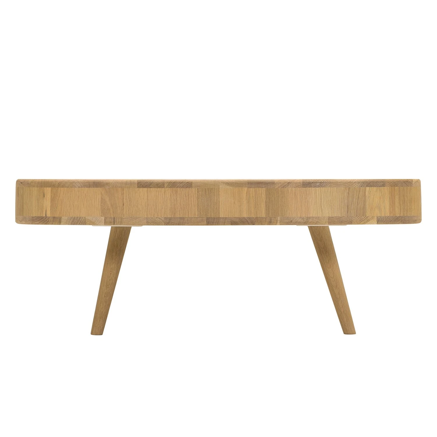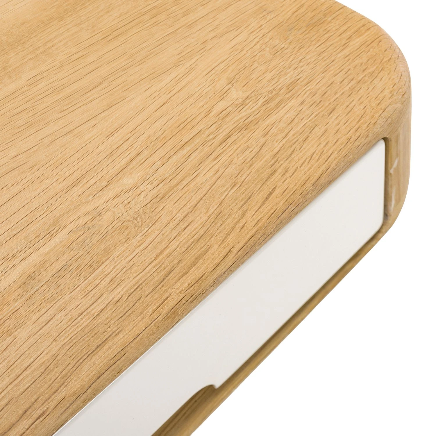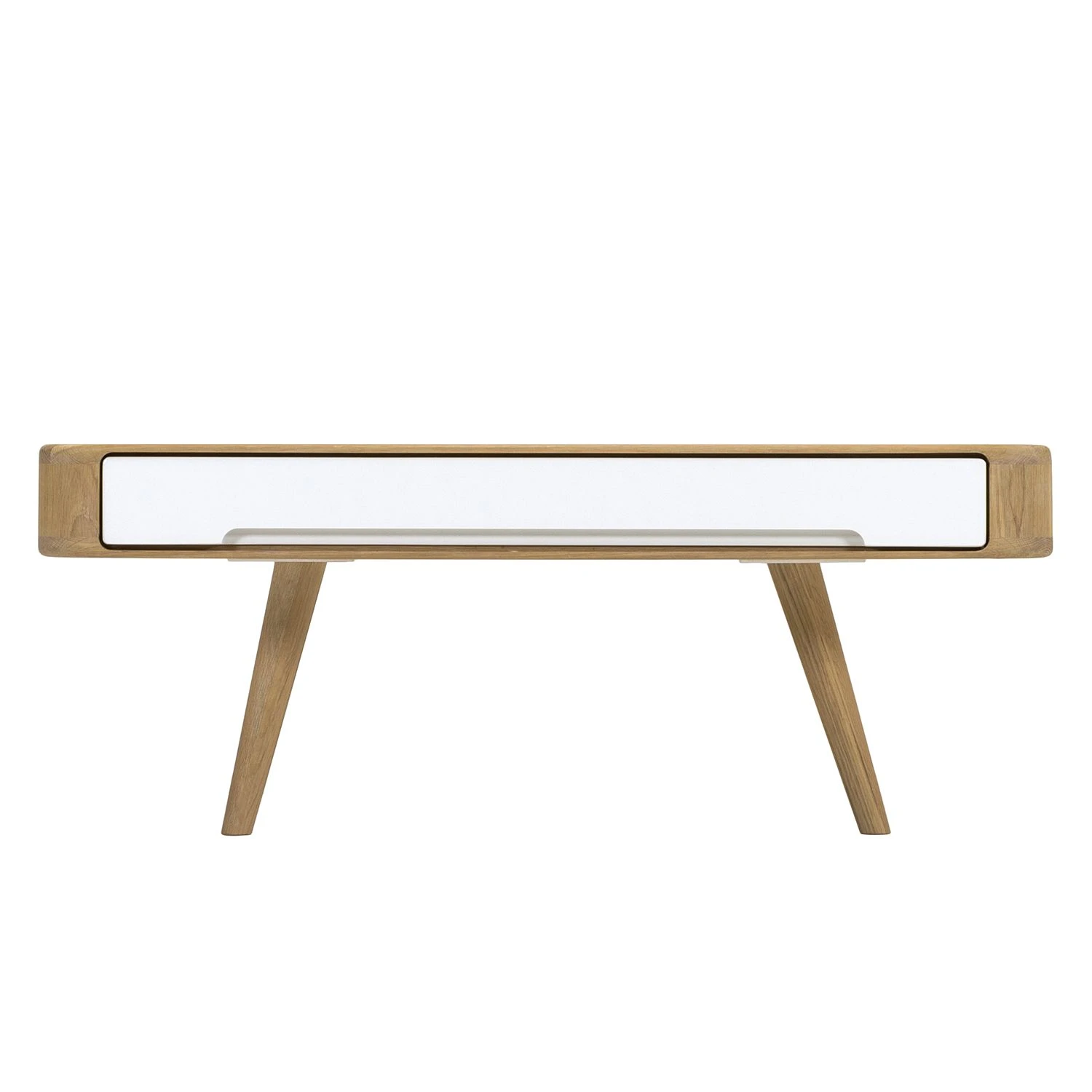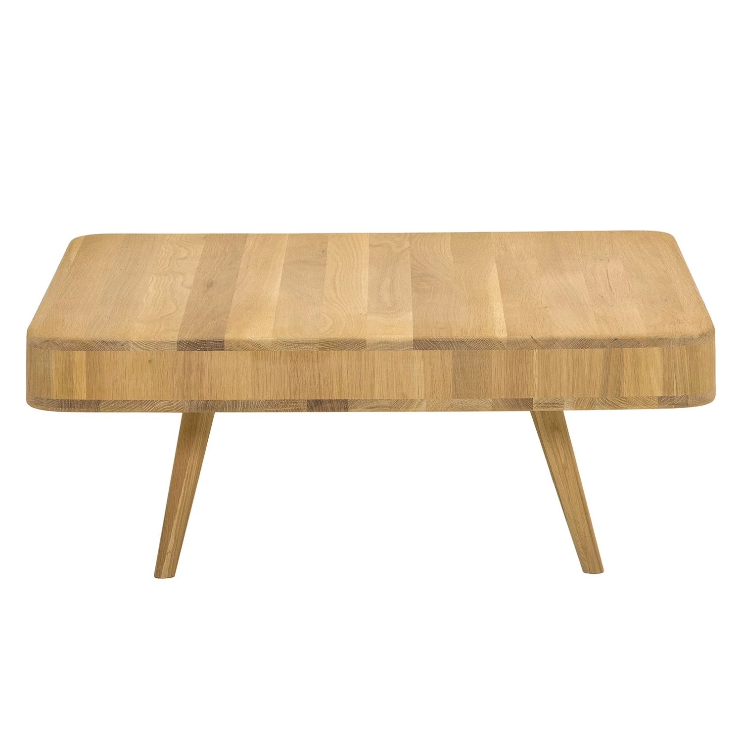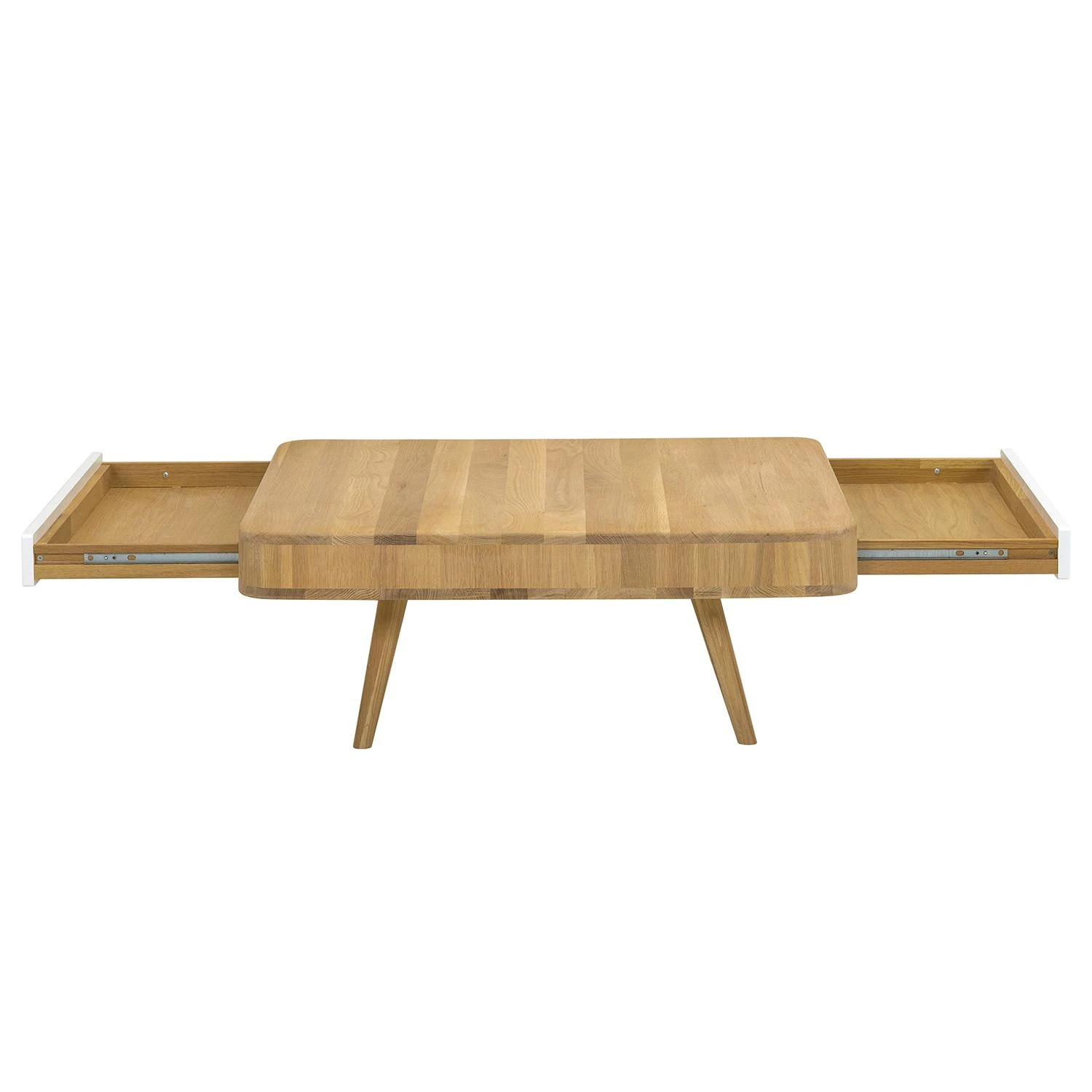 Die quadratische Tischplatte mit den abgerundeten Ecken und die ausgestellten Beine machen den Couchtisch Loca I zu einem besonders eleganten Möbelstück für moderne Wohnräume. Neben seinem edlen Erscheinungsbild im skandinavischen Retro-Design besticht der Couchtisch Loca I auch durch seine hochwertigen Materialien: Sowohl der Korpus als auch die sich nach unten verjüngenden Füße wurden aus massiver, gebeizter und geölter Wildeiche gefertigt. Die beiden praktischen Schubladen sorgen nicht nur für Stauraum: Dank ihrer farblich abgesetzten Fronten aus MDF-Platten verleihen sie dem Couchtisch Loca I ein besonders frisches Aussehen.