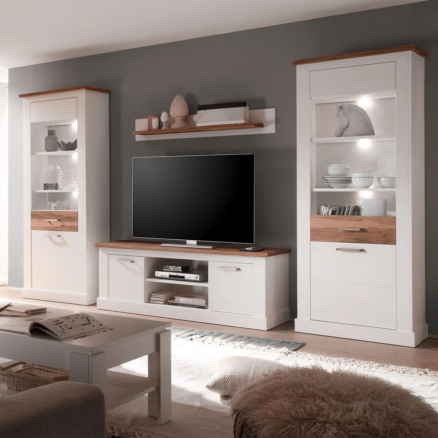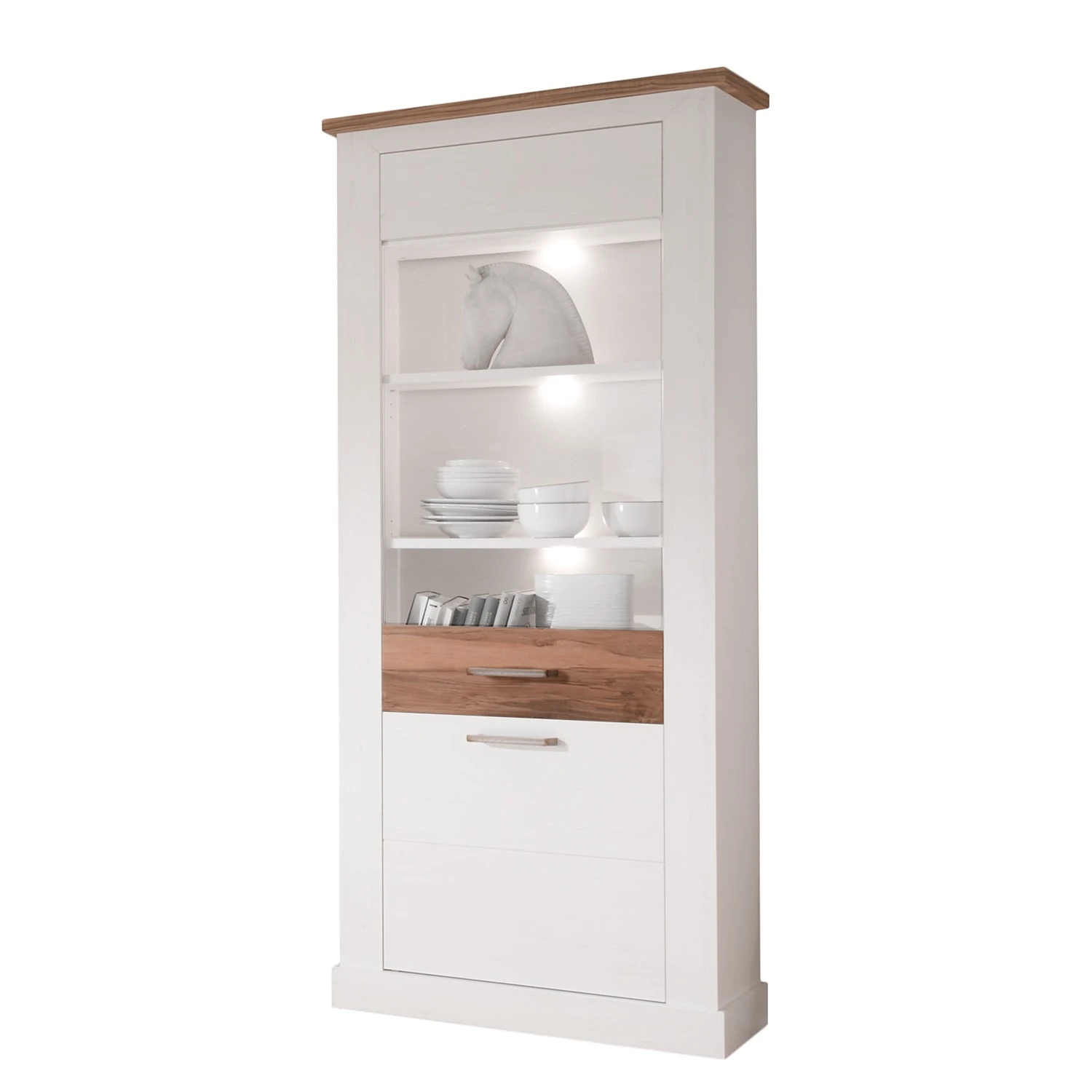Durch die klassische Eleganz und die Natürlichkeit des hellen Pinien-Dekors ist die Standvitrine Inuvik ein echtes Unikat. Aufgrund der schönen weißen Farbe sowie der klaren, geradlinigen Form zieht dieses Möbelstück alle Blicke auf sich. Egal, ob im Ess- oder Wohnzimmer, die Standvitrine Inuvik ist in verschiedenen Räumen einsetzbar und bietet Stauraum mit natürlichem Flair. Die Absetzung im Nussbaum-Dekor macht aus dieser Vitrine ein einzigartig zeitloses Möbelstück im Skandi-Stil. Sie verleiht den eigenen Räumen Behaglichkeit und eine harmonische Ausstrahlung.